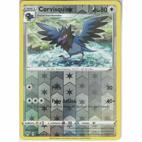 Original price £1.06 - Original price £1.06Original price£1.06£1.06 - £1.06Current price £1.06| /Out of stock1x Near Mint Corvisquire 155/189 Uncommon Reverse Holo Pokemon Card from the SWSH03 Darkness Ablaze expansion of the Pokemon Trading Card Game.