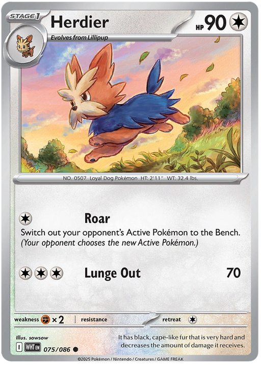 Original price £0.30 - Original price £0.30Original price£0.30£0.30 - £0.30Current price £0.30| /Out of stock1x Near Mint Herdier 075/086 Common Pokemon Card from the Scarlet & Violet White Flare expansion of the Pokemon Trading Card Game.