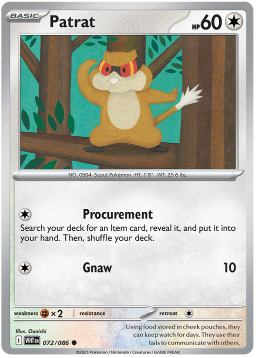 Original price £0.30 - Original price £0.30Original price£0.30£0.30 - £0.30Current price £0.30| /Out of stock1x Near Mint Patrat 072/086 Common Pokemon Card from the Scarlet & Violet White Flare expansion of the Pokemon Trading Card Game.