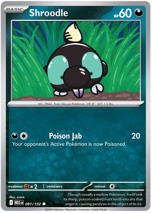 Original price £0.30 - Original price £0.30Original price£0.30£0.30 - £0.30Current price £0.30| /Out of stock1x Near Mint Shroodle 091/132 Common Pokemon card from the Mega Evolution Base Set of the Pokemon Trading Card Game.