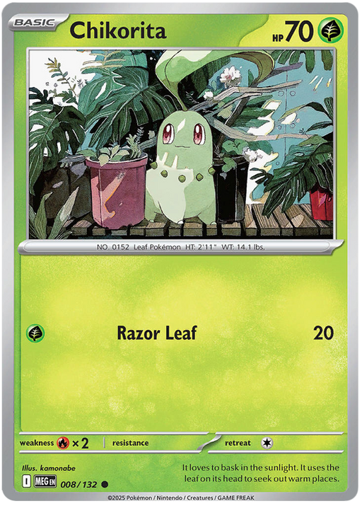 Original price £0.30 - Original price £0.30Original price£0.30£0.30 - £0.30Current price £0.30| /Out of stock1x Near Mint Chikorita 008/132 Common Pokemon card from the Mega Evolution Base Set of the Pokemon Trading Card Game.