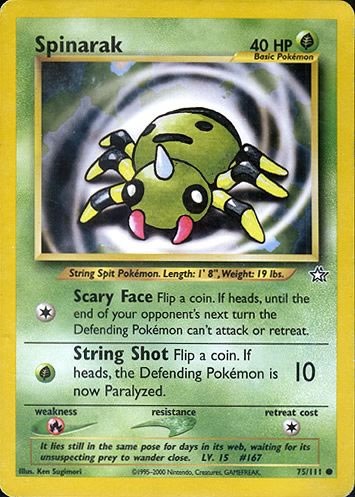 Original price £2.99 - Original price £2.99Original price£2.99£2.99 - £2.99Current price £2.99| /Out of stockA near mint Spinarak 75/111 1st Edition Pokemon Card from Neo Genesis set of the Pokemon TCG..