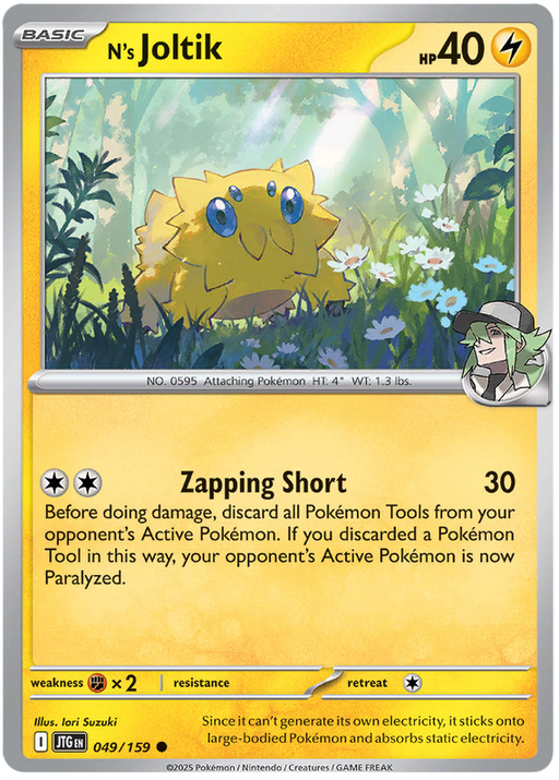 Original price £0.30 - Original price £0.30Original price£0.30£0.30 - £0.30Current price £0.30| /Out of stock1x Near Mint N's Joltik 049/159 Common Pokemon Card from the Scarlet & Violet: Journey Together set of the Pokemon Trading Card Game.