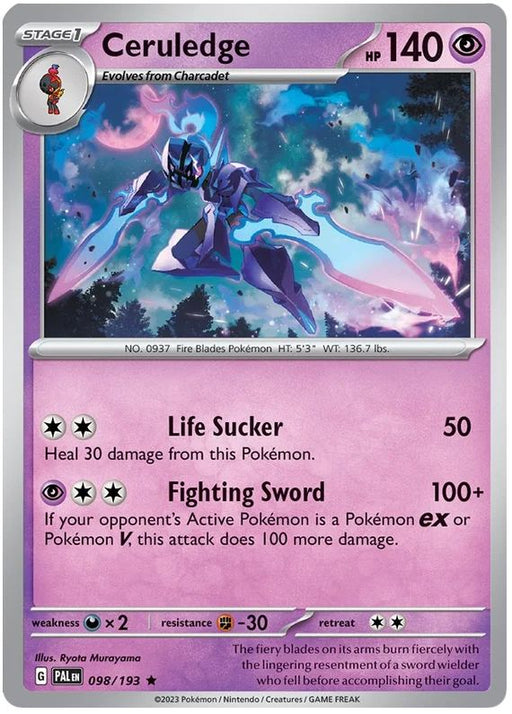 Original price £1.00 - Original price £1.00Original price£1.00£1.00 - £1.00Current price £1.00| /Out of stock1x Near Mint Ceruledge 098/193 Rare Reverse Holo Pokemon Card from the Scarlet & Violet Paldea Evolved expansion of the Pokemon Trading Card G...