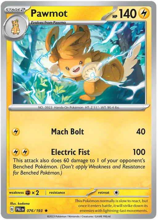 Original price £1.00 - Original price £1.00Original price£1.00£1.00 - £1.00Current price £1.00| /Out of stock1x Near Mint Pawmot 076/193 Rare Reverse Holo Pokemon Card from the Scarlet & Violet Paldea Evolved expansion of the Pokemon Trading Card Game.