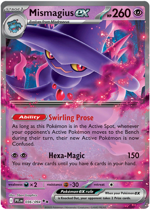 Original price £2.75 - Original price £2.75Original price£2.75£2.75 - £2.75Current price £2.75| /Out of stock1x Near Mint Mismagius ex 036/094 Double Rare Pokemon Card from the Mega Evolution: Phantasmal Flames expansion of the Pokemon Trading Card Game.
