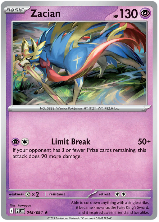Original price £1.99 - Original price £1.99Original price£1.99£1.99 - £1.99Current price £1.99| /Out of stock1x Near Mint Zacian 045/094 Rare Pokemon Card from the Mega Evolution: Phantasmal Flames expansion of the Pokemon Trading Card Game.