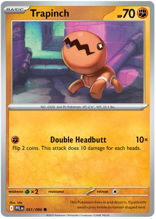 Original price £0.20 - Original price £0.20Original price£0.20£0.20 - £0.20Current price £0.20| /Out of stock1x Near Mint Trapinch 051/094 Common Pokemon Card from the Mega Evolution: Phantasmal Flames expansion of the Pokemon Trading Card Game.