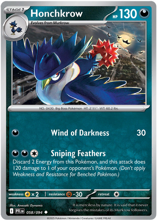 Original price £0.25 - Original price £0.25Original price£0.25£0.25 - £0.25Current price £0.25| /Out of stock1x Near Mint Honchkrow 058/094 Uncommon Pokemon Card from the Mega Evolution: Phantasmal Flames expansion of the Pokemon Trading Card Game.