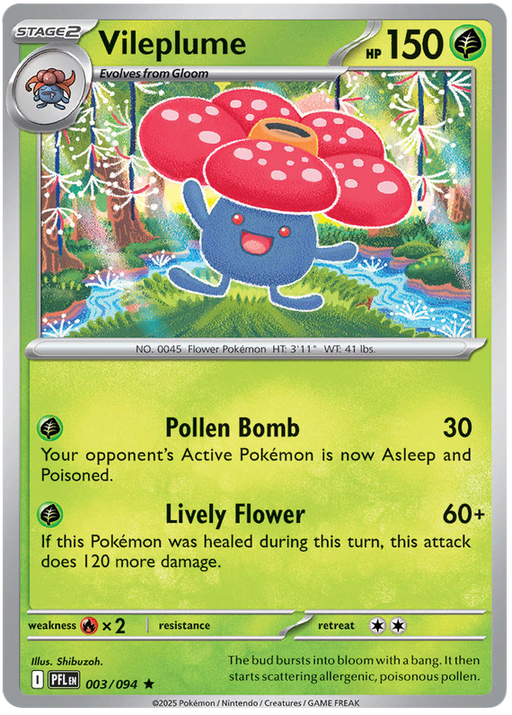 Original price £1.99 - Original price £1.99Original price£1.99£1.99 - £1.99Current price £1.99| /Out of stock1x Near Mint Vileplume 003/094 Rare Pokemon Card from the Mega Evolution: Phantasmal Flames expansion of the Pokemon Trading Card Game.