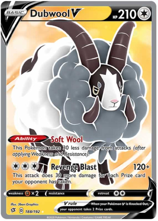 Original price £6.89 - Original price £6.89Original price£6.89£6.89 - £6.89Current price £6.89| /Low stock1x Near Mint Dubwool V 188/192 Ultra Rare Pokemon Card from the Sword & Shield Rebel Clash set of the Pokemon Trading Card Game.