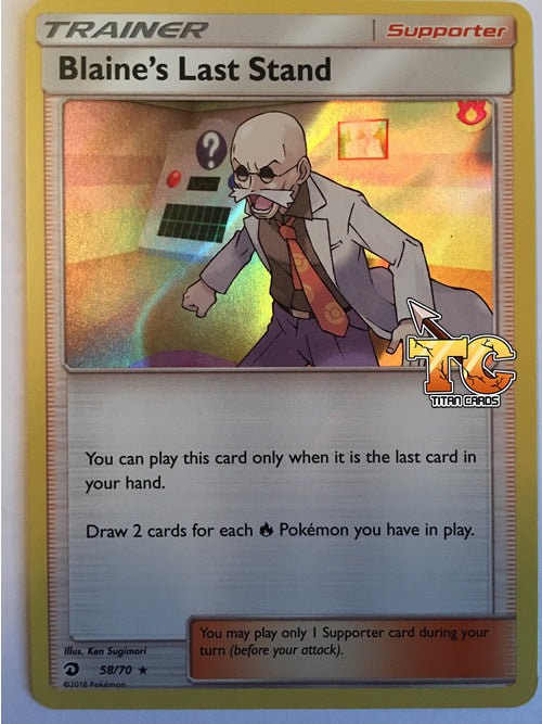 1x Near Mint Blaines Last Stand 58/70 Rare Holo Pokemon Card from the Dragon Majesty mini expansion of the Pokemon Trading Card Game. The card is pack fresh and will be sent to you in a soft sleeve and solid toploader for protection in transit.