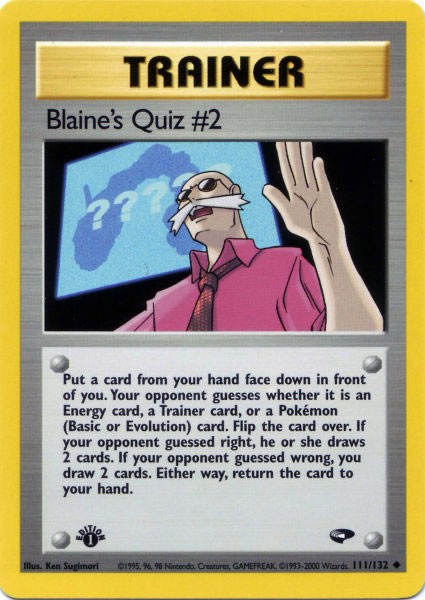 A near mint Blaine's Quiz #2 111/132 Pokemon card from Gym Challenge set of the Pokemon TCG.