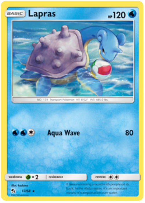 1x Near Mint Lapras 17/68 Rare Reverse Holo Pokemon Card from the Sun & Moon Hidden Fates set of the Pokemon TCG. The card will be sent well protected in transit.