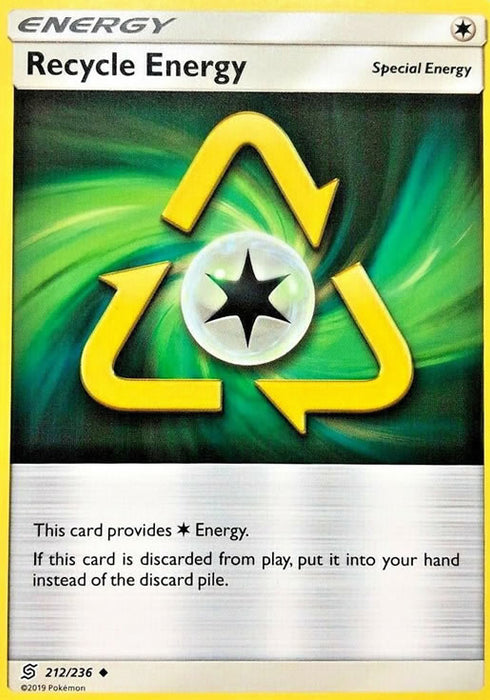 1x Near Mint Recycle Energy 212/236 Uncommon Pokemon Energy Card from the Sun & Moon SM11 Unified Minds set of the Pokemon TCG.